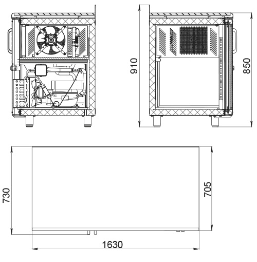 - Габариты: ширина 1630 мм, глубина 705 мм, высота 910 мм