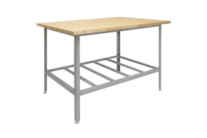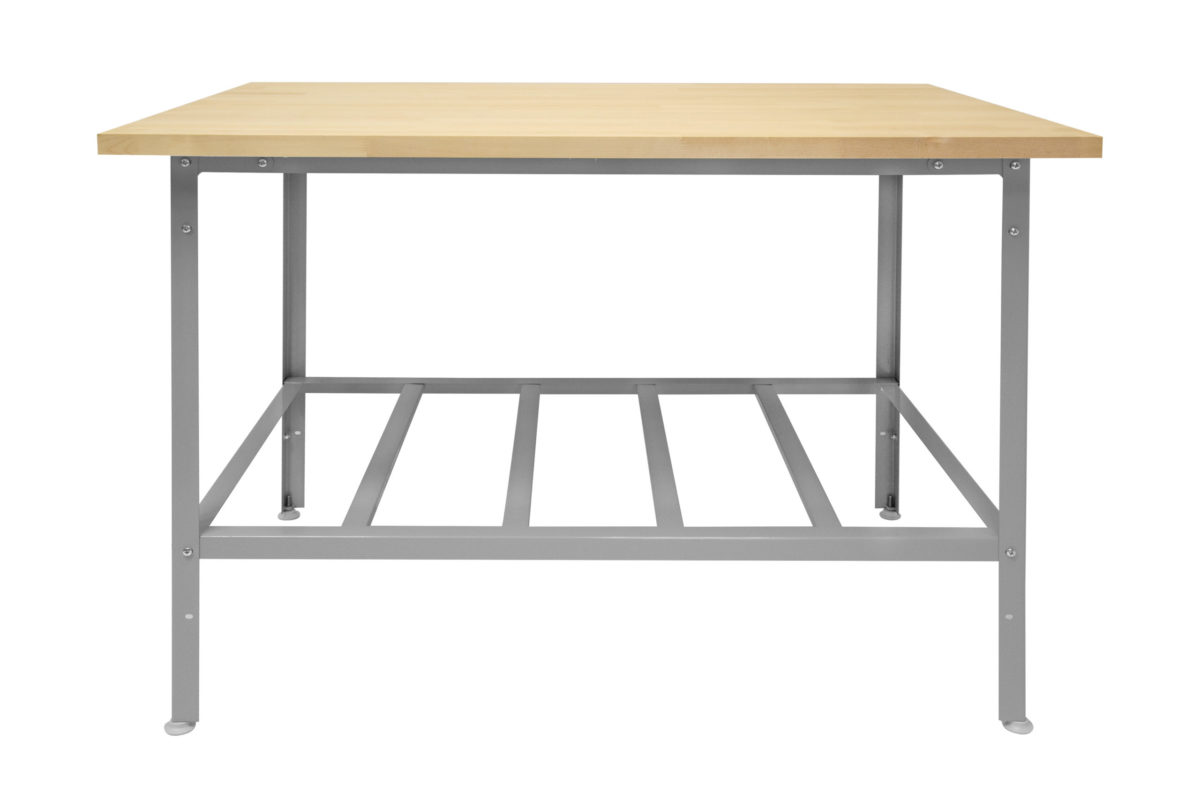 Столешница выполнена из клееного березового массива толщиной 20 мм, что гарантирует прочность и долговечность. Разборный каркас изготовлен из крашеной стали, а нижняя полка-решетка предоставляет дополнительное пространство для хранения посуды и вспомогательных инструментов. Стол легко собирается без необходимости в специальных инструментах, а регулируемые ножки позволяют компенсировать неровности пола, обеспечивая стабильность конструкции.
