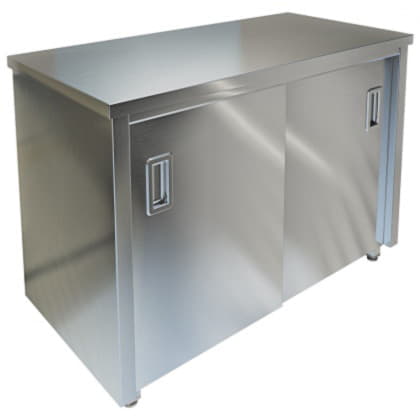 Стол-тумба может использоваться как обычный разделочный стол и одновременно для хранения посуды, кухонного инвентаря, сухих видов продуктов и столовых приборов. Стол-тумба имеет цельносварную конструкцию. Столешница изготовлена из пищевой нержавеющей стали, внутри столешницы ЛДСП. Внутри стола-тумбы основание и полка из пищевой нержавеющей стали, задняя стенка стола из нержавеющей стали. Раздвижные дверцы "купе" позволяют сэкономить пространство кухни при их открытии. Ножки стола снабжены регуляторами высоты, что позволяет устранять неровности пола. Изделие легко моется.