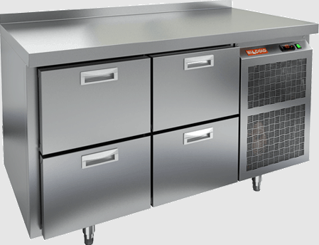 Холодильный агрегат расположен справа, что позволяет оптимально использовать пространство. Устройство не имеет гастронормированных характеристик, но оборудовано бортиком для предотвращения случайного высыпания продуктов. Стол работает от сети с напряжением 220 В и мощностью 0,575 кВт.