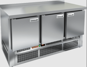 Холодильный агрегат расположен в нижней части устройства, что способствует оптимальному распределению температуры. Стол не имеет гастронормированных размеров, но оснащен бортиком для предотвращения случайного высыпания содержимого. Устройство работает от сети с напряжением 220 В и мощностью 0,575 кВт.