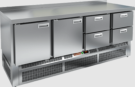 что делает его удобным для размещения в различных кухонных помещениях. Корпус и столешница выполнены из нержавеющей стали, что обеспечивает долговечность и легкость в уходе. Толщина теплоизоляции составляет 50 мм, что способствует эффективному сохранению холода.