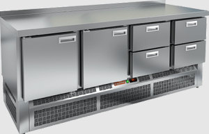 Холодильный агрегат расположен в нижней части конструкции, что способствует оптимальному распределению пространства. Стол не имеет гастронормированных размеров, но оснащен бортом для предотвращения случайного падения продуктов. Устройство работает от сети с напряжением 220 В и мощностью 0,66 кВт.