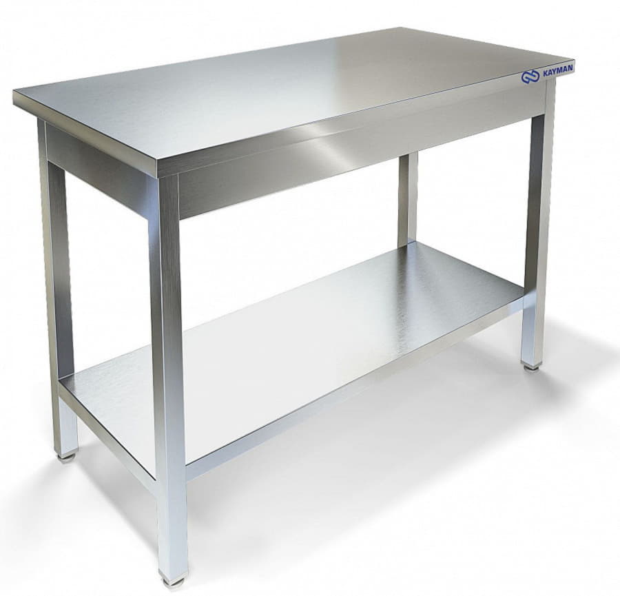 Столы производственные имеют широкую область применения: в пищеблоках, продовольственных магазинах, в цехах, связанных с переработкой пищевого сырья и т. д. Стол производственный имеет сборно-разборную конструкцию. Он состоит из столешницы и каркаса, изготовленного из нержавеющего уголка. Столы без борта устанавливаются в центре кухонного помещения и предназначены для четырёхстороннего доступа к рабочей поверхности. Столы укомплектованы сплошнойй полкой-накладкой. Ножки стола снабжены регуляторами высоты, что позволяет устранять неровности пола. В конструкции стола использованы элементы для придания устойчивости и предотвращения раскачивания во время эксплуатации. Универсальная конструкция позволяет легко производить сборку стола.