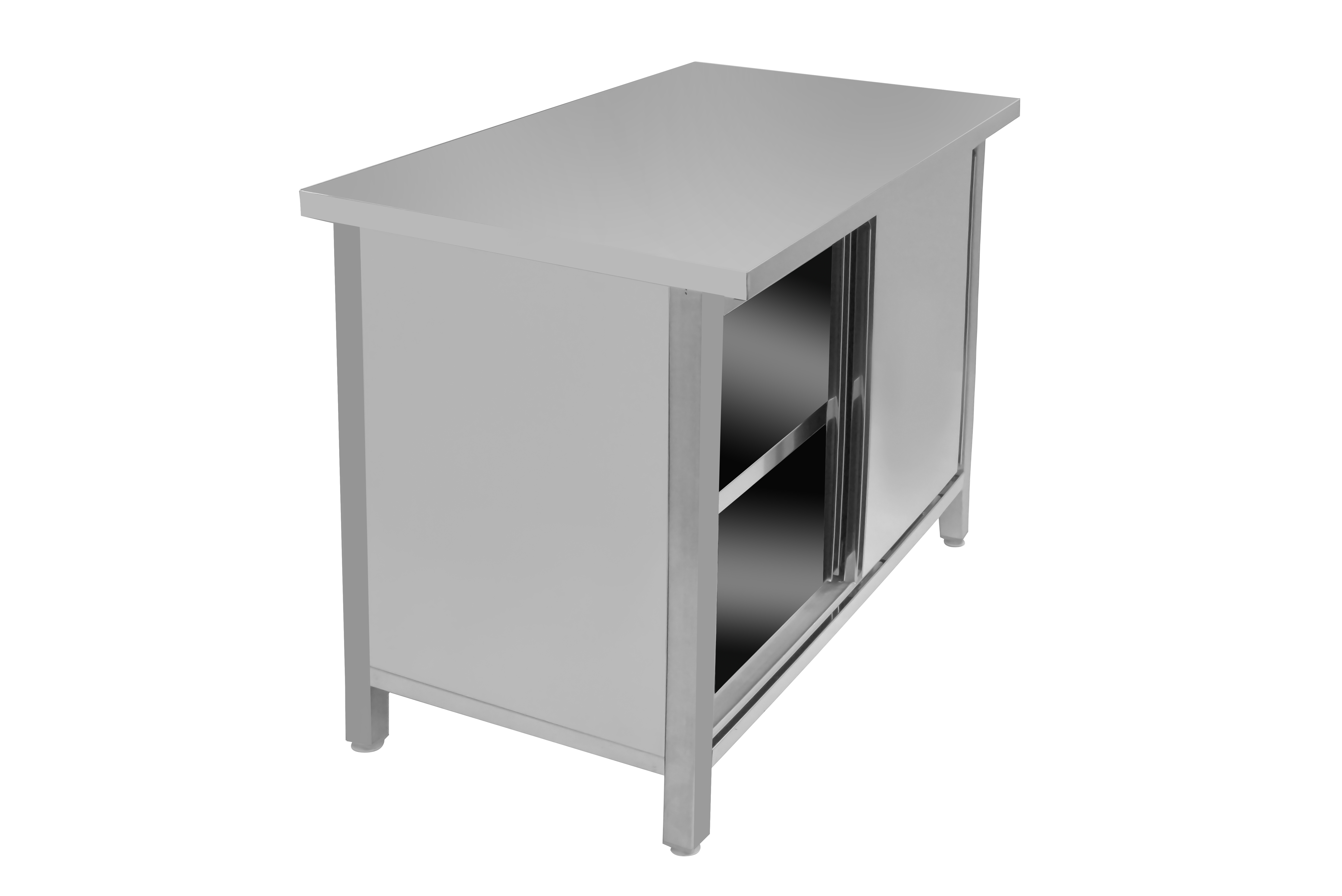 Отсутствие борта позволяет устанавливать стол в любом месте и работать с любой стороны. Сплошная полка и дно конструкции усилены ребром жесткости, что увеличивает полезное пространство для размещения посуды и продуктов. Регулируемые по высоте ножки позволяют компенсировать неровности пола, обеспечивая стабильность.