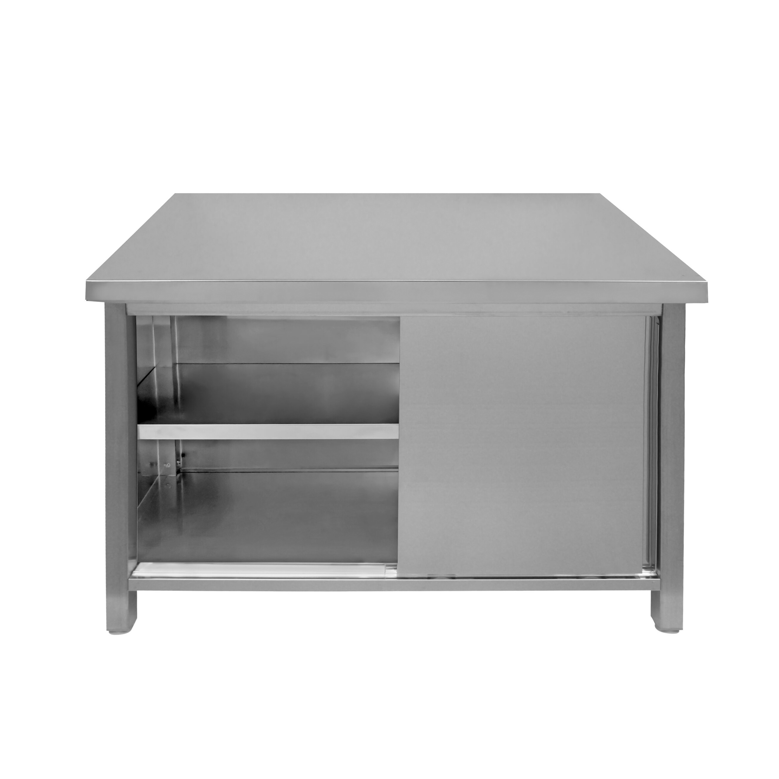 Данная модель оснащена прямоугольной столешницей, выполненной из пищевой нержавеющей стали AISI 430, которая дополнительно укреплена древесно-стружечной плитой с внутренней стороны. Это обеспечивает высокую прочность и предотвращает прогиб столешницы. Стол имеет сплошную полку и каркас, изготовленные из крашеной стали, что гарантирует долговечность и надежность. Все кромки столешницы обработаны, а углы заварены и зашлифованы, что исключает риск травм при использовании и санитарной обработке.
