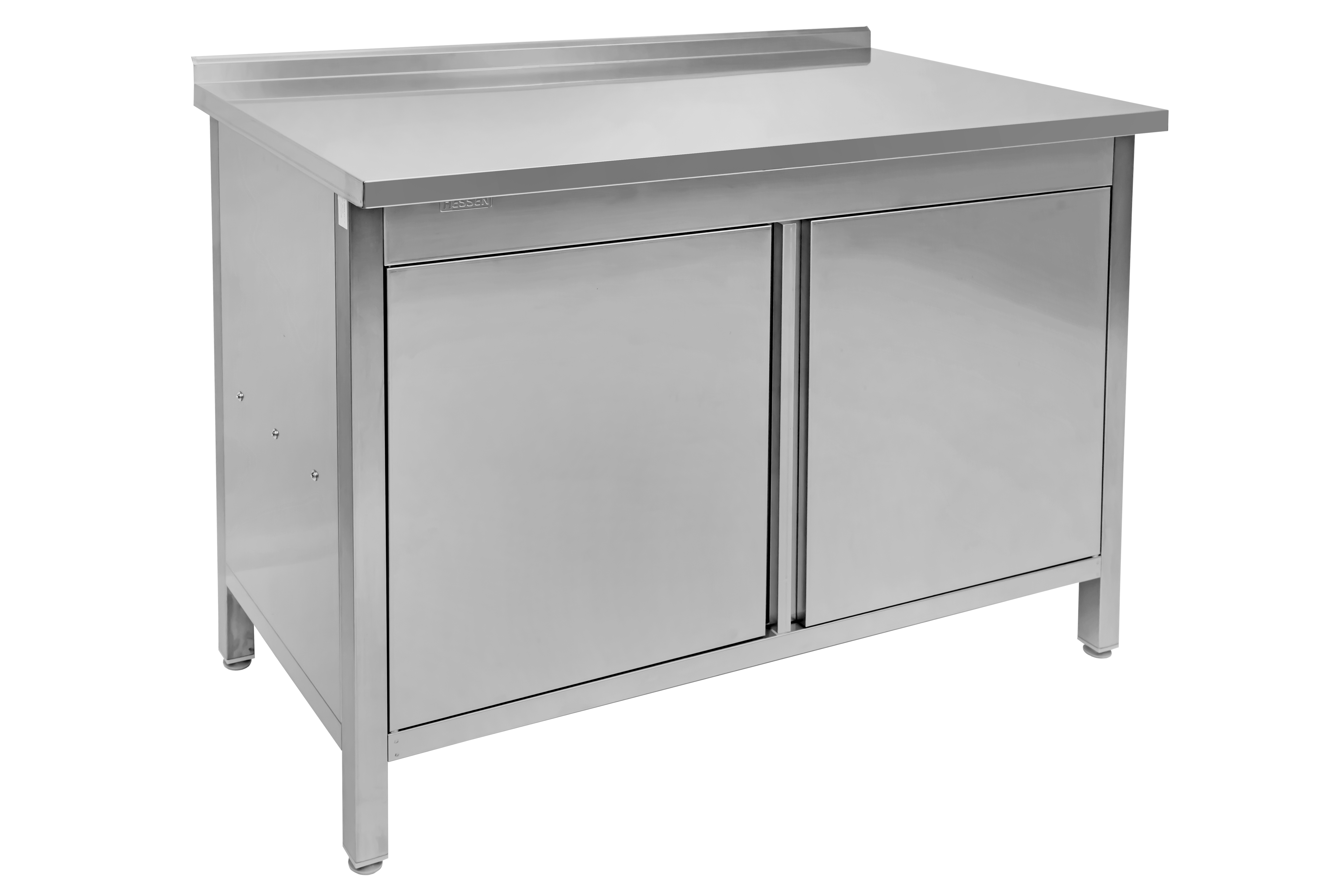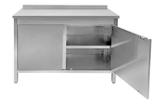 Стол с распашными дверцами имеет прямоугольную столешницу, обрамленную бортиком из нержавеющей стали AISI 430, который с внутренней стороны усилен древесно-стружечной плитой. Это обеспечивает высокую прочность и предотвращает прогиб столешницы. Каркас и полка выполнены из крашеной стали, а все кромки столешницы обработаны, что исключает риск травм при использовании и санитарной обработке. Бортик позволяет устанавливать стол вдоль стены, предотвращая загрязнение пола остатками продуктов и упрощая уборку.