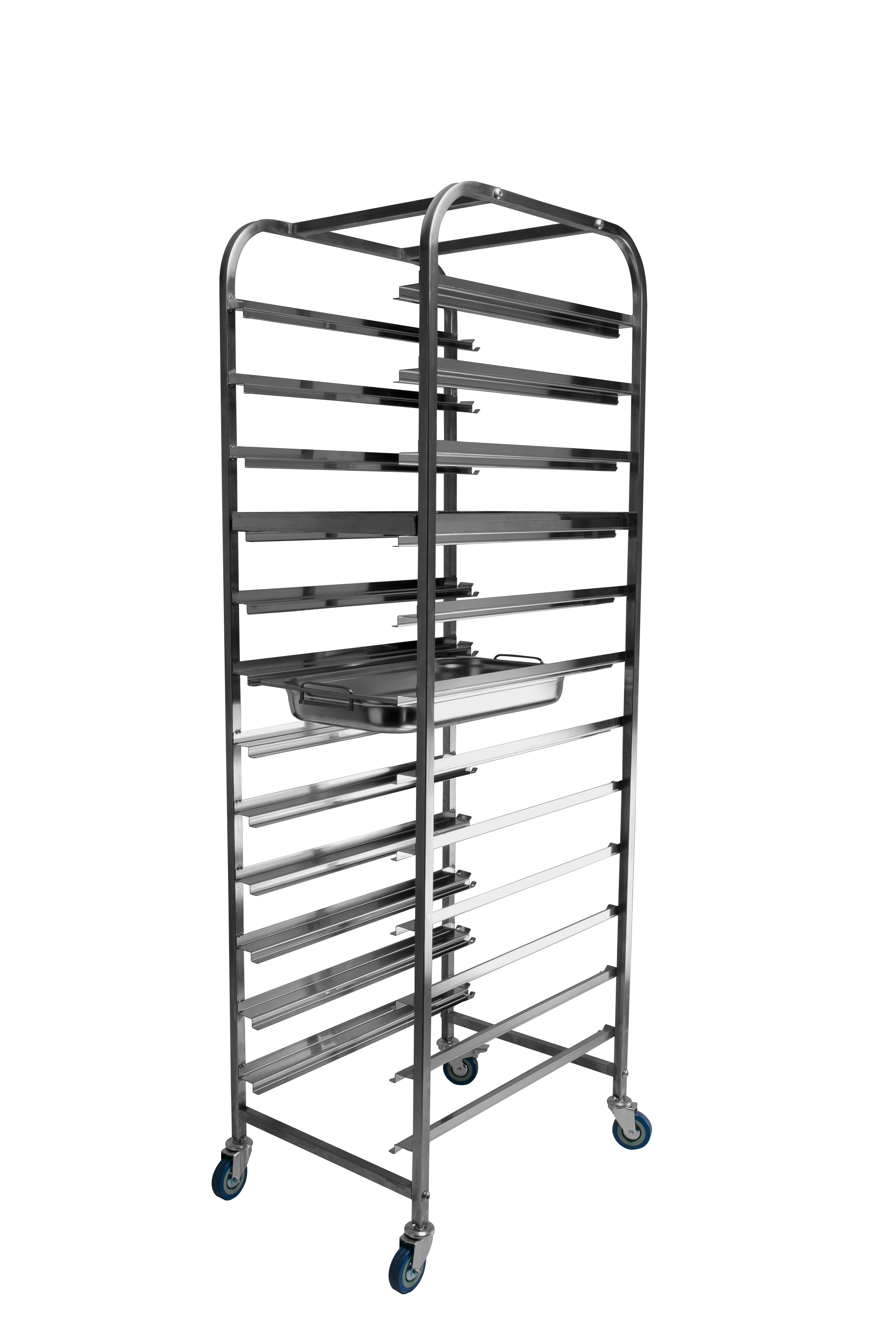 Тележка имеет 12 рядов направляющих для гастроемкостей с расстоянием между ними в 120 мм, что обеспечивает удобство загрузки по узкой стороне. Конструкция выполнена из высококачественной пищевой нержавеющей стали AISI 430 и состоит из двух стоек с приваренными направляющими и четырьмя перекладинами. Стойки изготовлены из квадратных труб.