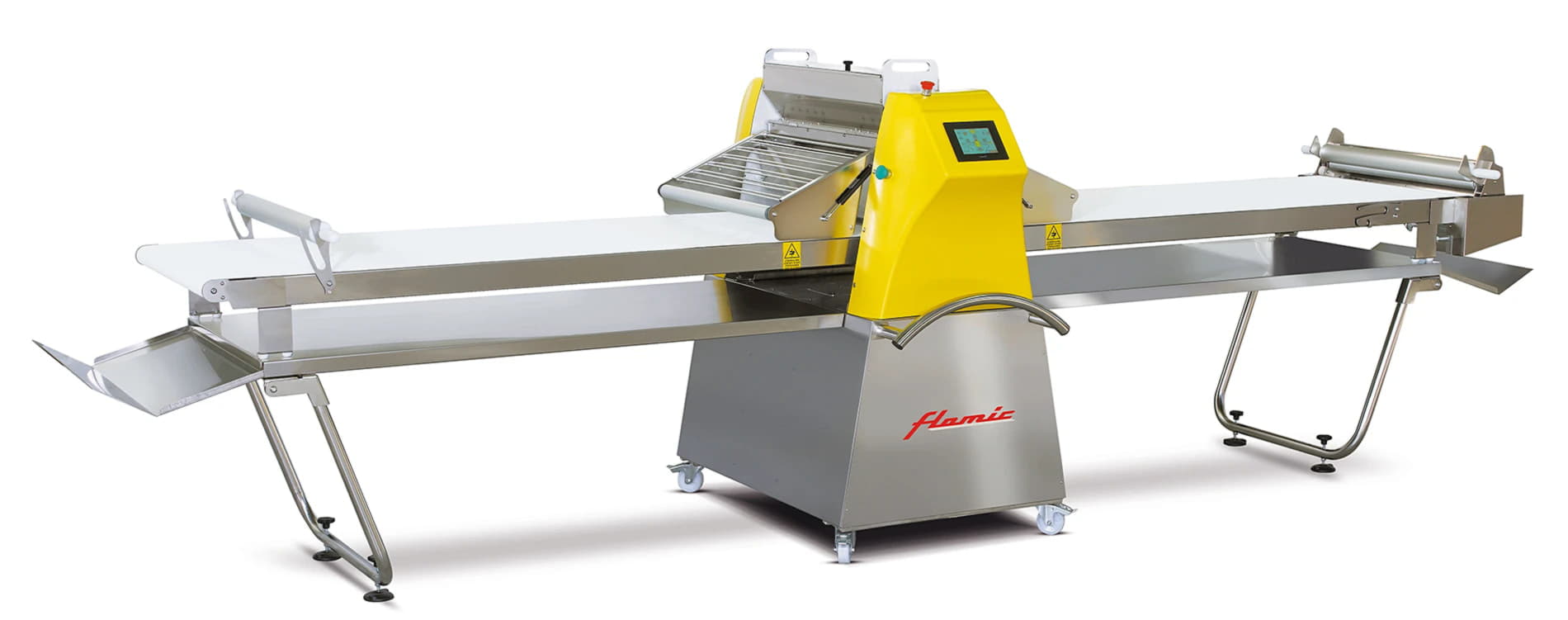 Регулируемая скорость между входящим и выходящим транспортерами, гарантирующая постоянную раскатку теста.