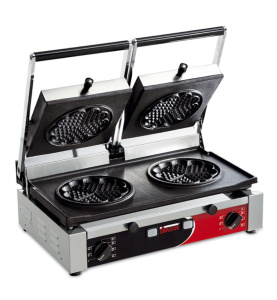 Модель оборудована двумя парами рабочих поверхностей из эмалированного чугуна, благодаря чему приготовляемые вафли не пристают к поверхности. Каждая из поверхностей имеет независимое управление, следовательно, рабочие поверхности вафельницы могут работать независимо друг от друга.