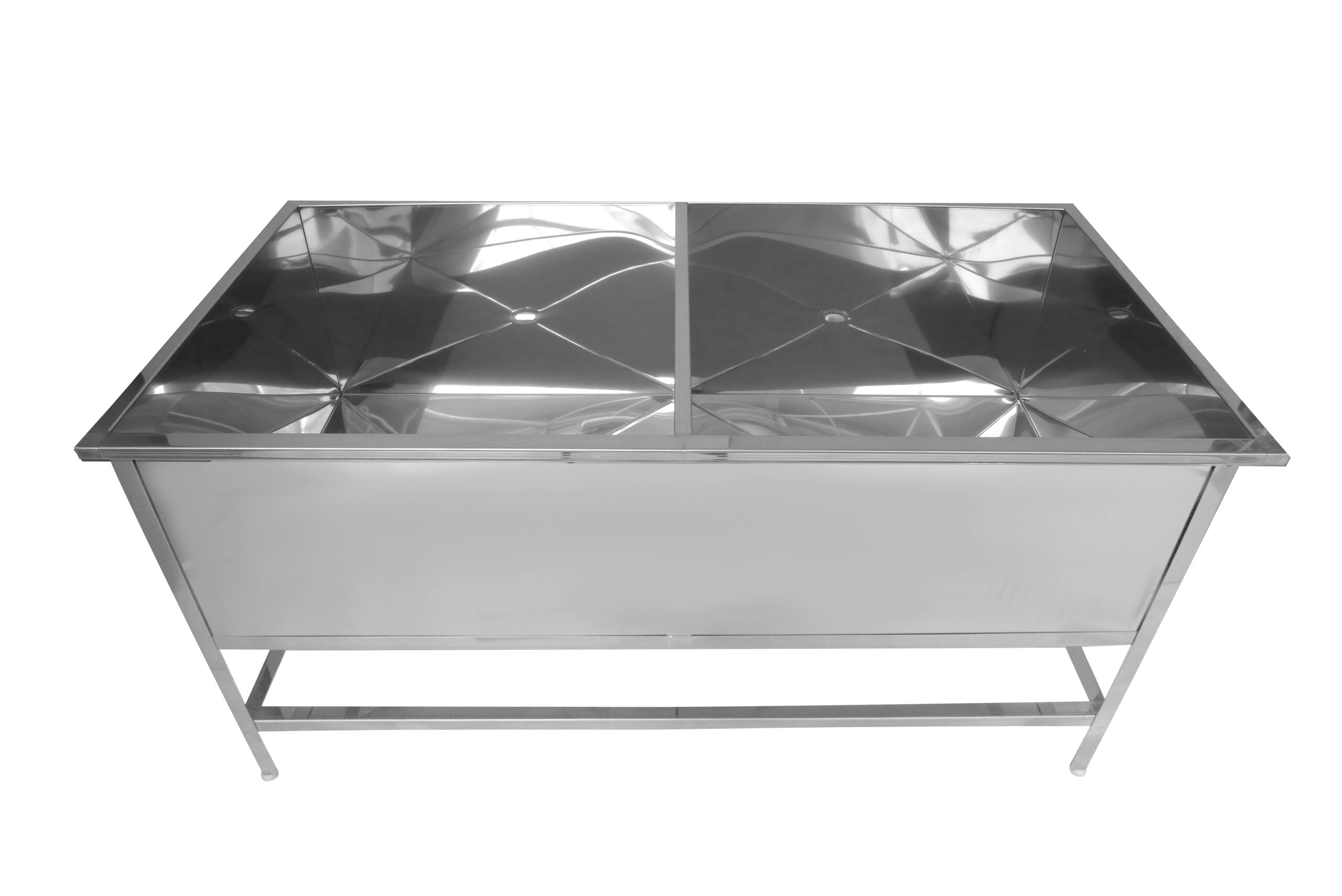 Каркас данной модели может быть выполнен как из крашенной, так и из нержавеющей стали, с толщиной металла 1,5 мм. Опорные ножки, выполненные в виде уголка размером 35х35 мм, регулируются по высоте в диапазоне ±20 мм, что позволяет адаптировать ванну под различные условия эксплуатации.