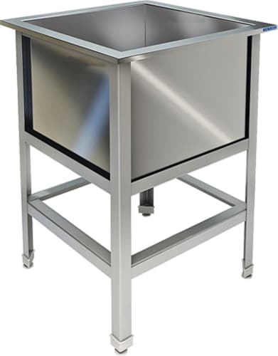 Ванны моечные являются необходимым атрибутом на любом предприятии общественного питания согласно требованиям СЭС. Используются ванны моечные для для мытья посуды, продуктов, инвентаря и т.п. Ванна состоит из одной сварной ёмкости мойки и каркаса. Мойка ванны сварная, выполнена из пищевой нержавеющей стали марки AISI 304 толщиной 0,8 мм и имеет отгибы, которые исключают травмирование персонала. Каркас разборный из нержавеющей стали AISI 430 толщиной 1,5 мм. Ножки ванны снабжены регуляторами высоты, что позволяет устранить неровности пола. Ванны комплектуются нержавеющим выпуском с решеткой диаметром 90 мм, диаметр выходного отверстия в сифоне 50 мм.