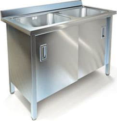 Ванны моечные являются необходимым атрибутом на любом предприятии общественного питания согласно требованиям СЭС. Используются ванны моечные для для мытья посуды, продуктов, инвентаря и т.п. Ванна состоит из двухсекционной цельнотянутой ёмкости мойки и каркаса. Мойка ванны цельнотянутая с шумопоглощающей изоляцией снизу, выполнена из пищевой нержавеющей стали марки AISI 304 толщиной 1 мм и имеет отгибы, которые исключают травмирование персонала, а также плоский пристенный борт. Каркас изготовлен из нержавеющей стали толщиной 1.2мм марки AISI 430. Раздвижные дверцы "купе" позволяют сэкономить пространство кухни при их открытии. Ножки ванны снабжены регуляторами высоты, что позволяет устранить неровности пола. Ванны комплектуются сифоном с переливом, нержавеющим выпуском с решеткой диаметром 90 мм, диаметр выходного отверстия в сифоне 50 мм.