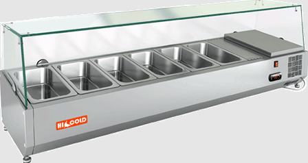 С размерами 1500 мм в ширину, 385 мм в глубину и 459 мм в высоту, она компактно вписывается в любое пространство. Объем витрины составляет 59 литров, что позволяет разместить до 5 контейнеров GN1/3 и 1 контейнер GN1/2.