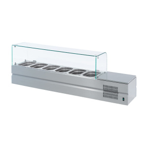 Над охлаждаемой ванной размещается гнутое (моллированное) стекло, которое предотвращает попадание в гастроемкости посторонних предметов.