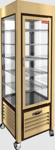 Электронная панель управления обеспечивает простоту в эксплуатации, а динамическое охлаждение и автоматическая оттайка гарантируют надежную работу устройства. Витрина выполнена из крашеной стали, что придаёт ей стильный внешний вид. Цветовое оформление – бежевый (RAL 1001) с коричневой рамкой (RAL 8017) – гармонично впишется в любой интерьер.