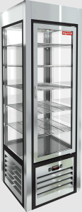 С размерами 600 мм в ширину и глубину, а высотой 1810 мм, данная модель обладает объемом 350 литров, что делает её вместительной для различных десертов. Витрина оснащена пятью полками, каждая из которых имеет размеры 535х535 мм и может выдерживать нагрузку до 5 кг. Расстояние между полками составляет 220 мм, что обеспечивает удобный доступ к товарам.
