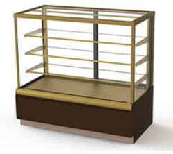 ВИТРИНА КОНДИТЕРСКАЯ KAYMAN K-ВК-900 КВАДРО СЕРЕБРО с рабочими температурами от 6 до +12 °С подходит для продажи из нее слоек, булочек и другой выпечки. Окрашенная в шоколадно-золотой цвет, она делает выкладку выглядящей очень аппетитно. Всестороннее остекление обеспечивает покупателям хороший обзор.