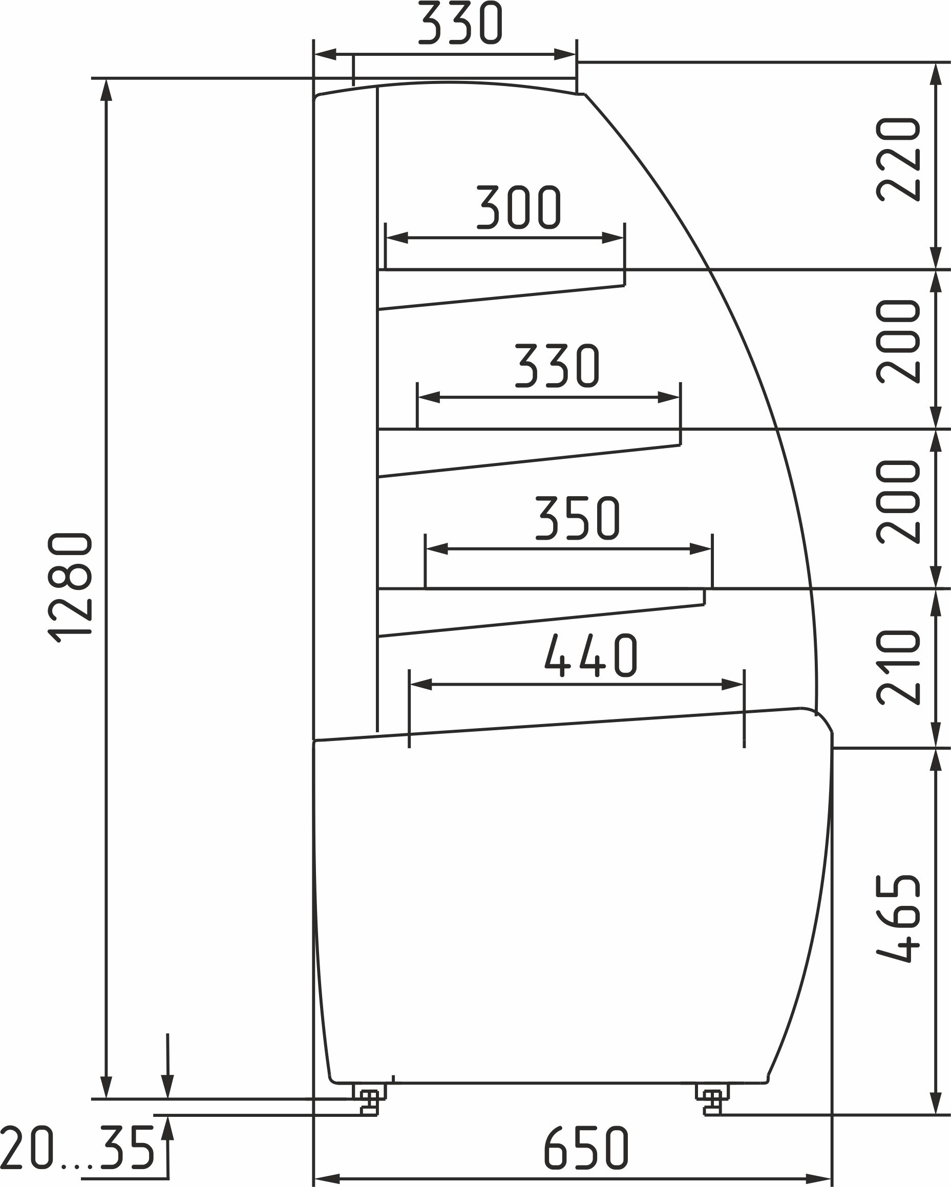 Витрина оснащена тремя полками, каждая из которых имеет подсветку для лучшего освещения продукции. Устройство работает от сети с напряжением 220 В и предназначено для установки на полу.