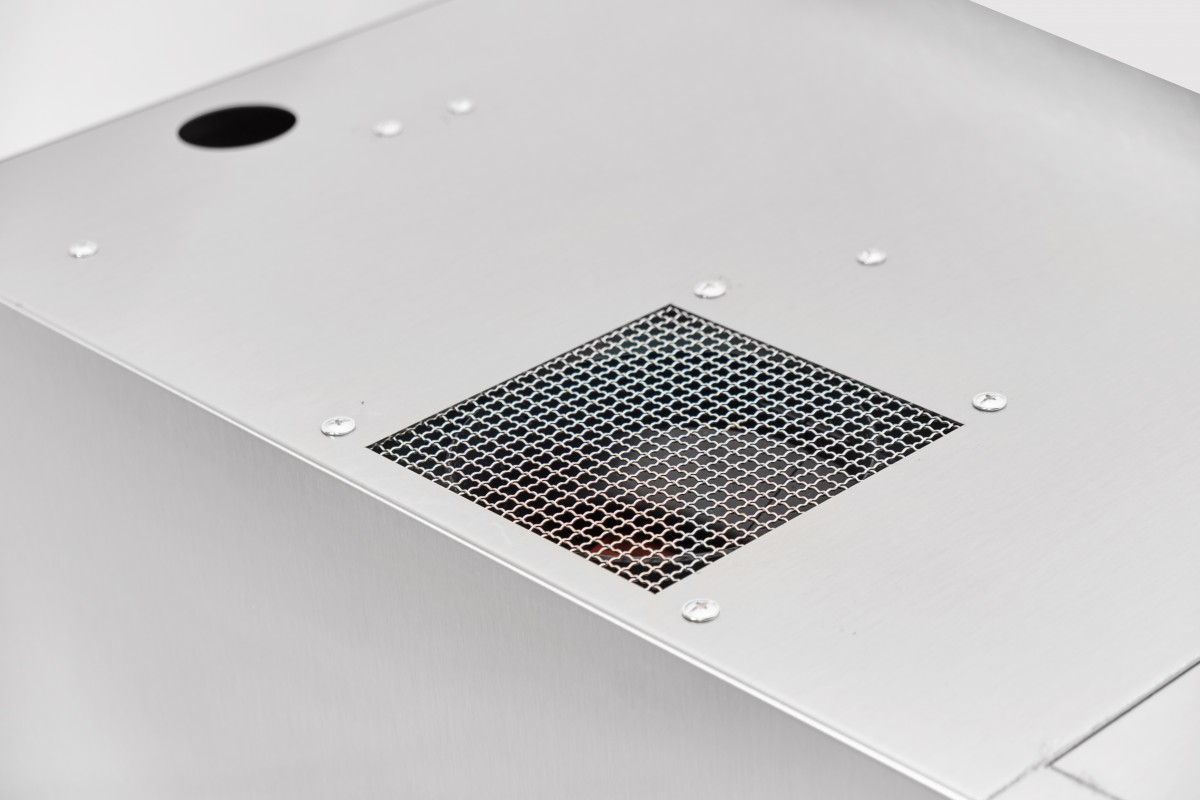 Зонт состоит из двух ключевых компонентов: каркаса теплообменника и воздухозаборника. Внутри каркаса размещены три теплообменника, угольные и лабиринтные фильтры, а также мощный всасывающий вентилятор. Подключение к пароконвектомату осуществляется с помощью 1,8-метрового кабеля с заземлением, а крепление выполняется с помощью винтов М5.